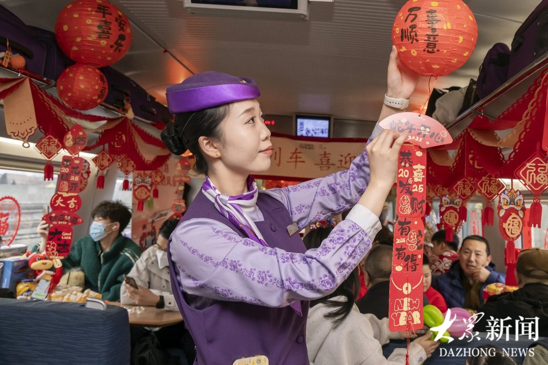 列车上,工作人员用精美的窗花、五彩的灯笼、喜庆的装饰,把餐车布置得喜气洋洋,暖意融融,让上车的旅客瞬间感受到了节日的氛围。满目的好吃的好玩的吸引了众多旅客驻足、停留。