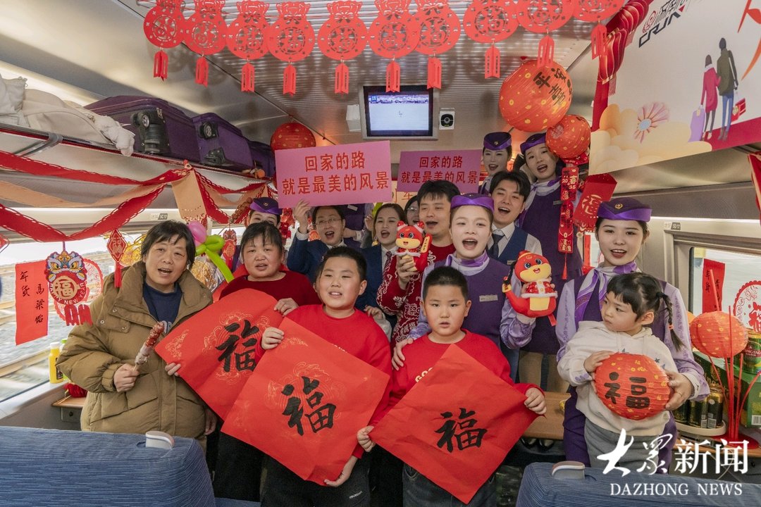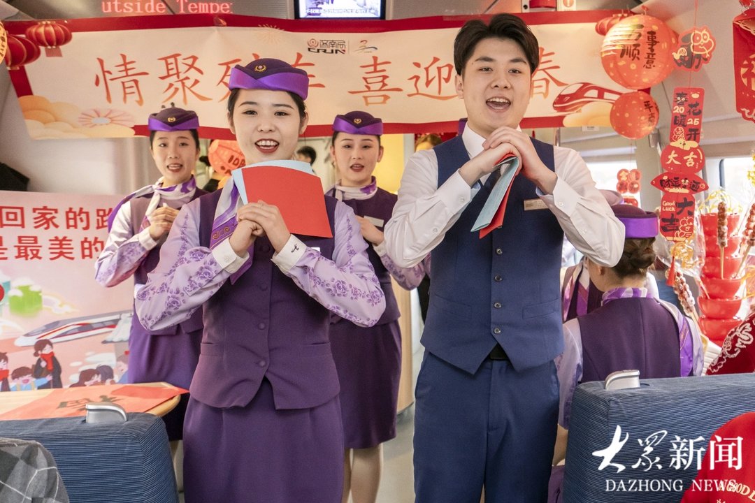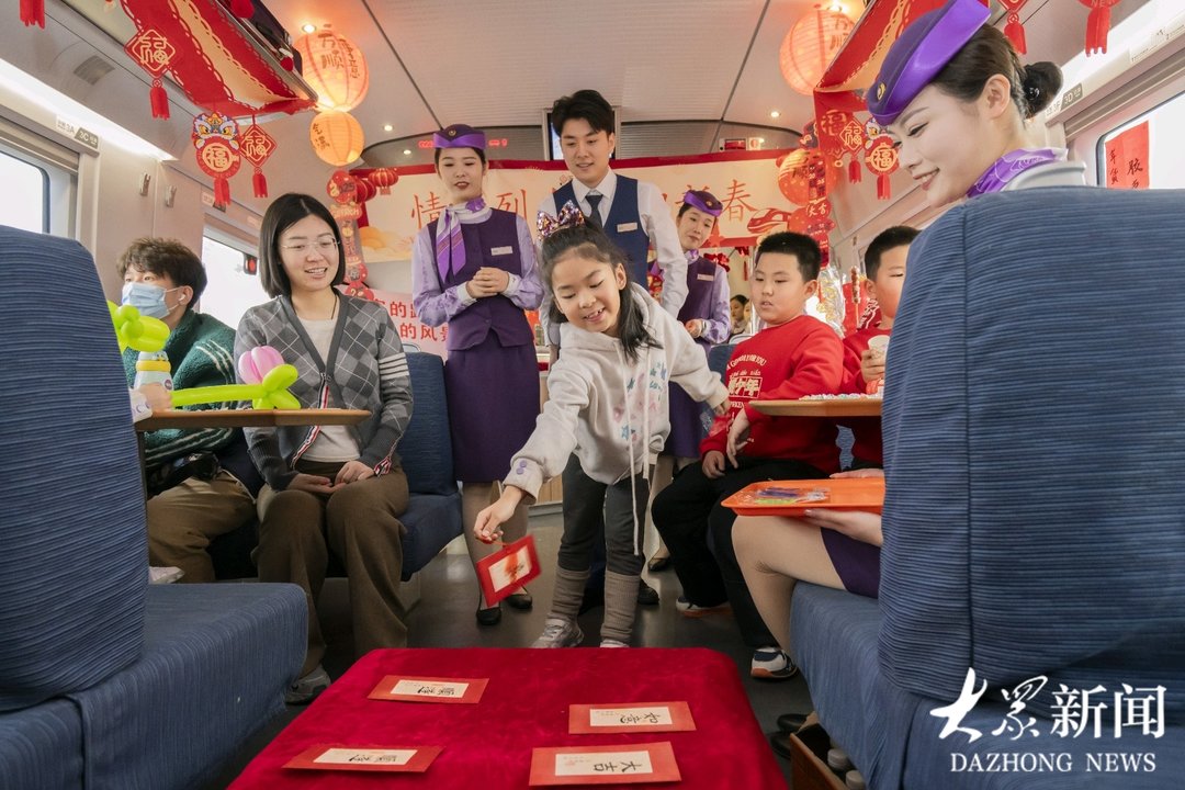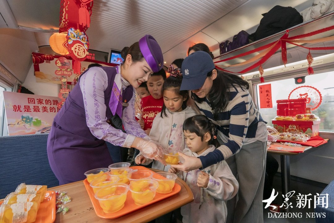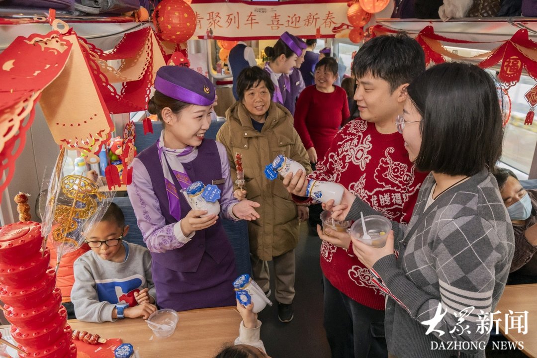 列车上,餐车工作人员还特别为旅客准备了民俗活动,既有“小手抓福”的抢红包游戏,也有歌舞送福的表演,还有山东特色美食年货的品尝和选购。胶东大饽饽、沂蒙黄桃罐头等美食勾起了旅客小时候的回忆,也吸引了异乡旅客的目光;德州扒鸡、流亭猪蹄等老字号以及青岛老酸奶、高粱饴等地方网红产品则吸引诸多旅客品尝,大家说笑间,一会尝尝一会买买,颇有一番赶集备年的味道。