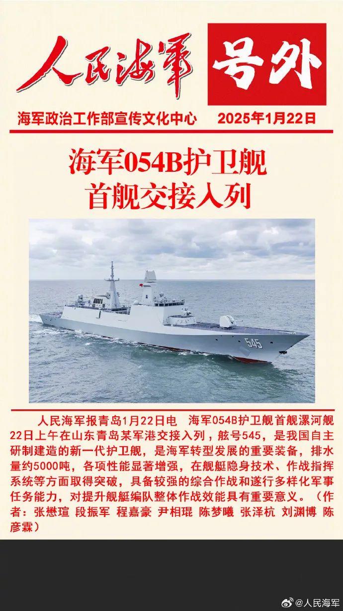海军054B护卫舰首舰漯河舰22日上午在山东青岛某军港交接入列。这次交接入列的中国人民解放军海军漯河舰,舷号545,是我国自主研制建造的新一代护卫舰,是海军转型发展的重要装备,排水量约5000吨,各项性能显著增强,在舰艇隐身技术、作战指挥系统、火力集成控制等方面取得突破,具备较强的综合作战和遂行多样化军事任务能力,对提升海军舰艇编队整体作战效能具有重要意义。 (摘自人民网手机客户端)