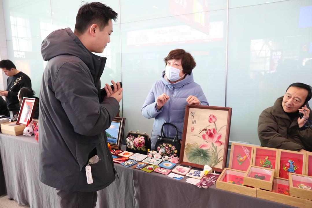招远文旅带来了国家级非遗项目龙口粉丝传统制作技艺、招远绒绣、金银壶传统制作技艺和招远市级非遗项目成文堂葫芦画在内的多种非遗产品,春节期间推出金镇新春庙会、罗山观瀑季、“戏曲村晚”、迎新春书画展等20余项主题活动,诚邀国内外游客来招远过大年;龙口市站的龙口线编、黄县面塑、泥老虎等非遗项目和各种文旅好物也来到了大集,更有精彩吕剧巡演、蛇年邮政文创、名家书法家现场送“福”等文化大餐,7大国家级景区同期推出非遗闹春、财神文化节等系列活动;蓬莱文旅不仅为市民游客带来蓬莱面塑、葫芦雕刻和石头画等非遗项目,还有各大知名景区丰富多彩的民俗活动,现场更是“八仙”各显神通,为旅客送上新春祝福,同时联动欧乐堡、纳帕溪谷酒庄等景区,现场赠送门票,带来折扣不等的优惠大放“价”,给大家带来一个既传统又新潮的中国年;烟台站的葫芦烙画、烟台手作香、烟台漆器、精品蛋雕、精品盘扣等10个特色非遗项目,也吸引旅客们纷纷尝试,现场精湛的表演、丰富的文化体验,赢得旅客们阵阵掌声,浓浓的年味溢满整个候车大厅。