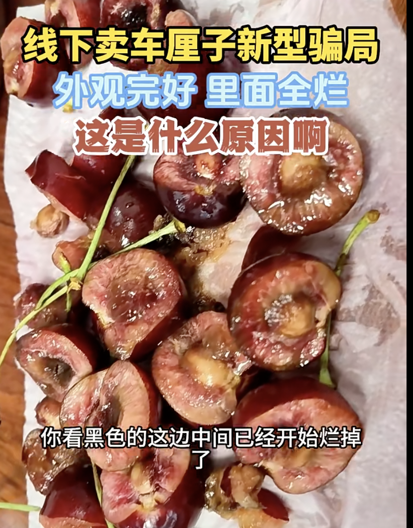 前几天我们就“原来的“高级水果”今年却跌下神坛,到底发生了什么?”做了详细分析。留言区不少人提到,明明到手时还很新鲜的车厘子,在家短短放了几天,就开始表面坑坑洼洼,果梗也从翠绿变褐、变黑,还有不少“外观完好,里面全烂”,是不是因为用了各种“科技狠活”?