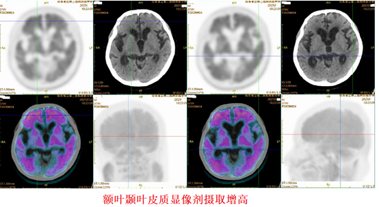 神经内科主任赵修敏、副主任刘磊接诊患者后,通过体格、神经心理学量表、脑脊液标记物等检查,对患者病情进行详细评估,并联合核医学科刘坚主任团队,为其进行了临床氟[¹⁸F]贝他苯PET脑显像。这项检查可提前15-20年早期精准诊断阿尔茨海默病,从而实现该病的早期诊断、干预、治疗。另外,随着阿尔茨海默病治疗技术的不断发展,大量治疗后患者也迫切需要通过该检查进行后期疗效评估及随访。这也是山东省立第三医院开展的我省首例氟[¹⁸F]贝他苯脑PET脑显像检查。经过检查,细致判读并确认β淀粉样蛋白(Aβ)显像阳性,明确了患者重度阿尔茨海默病的诊断。
