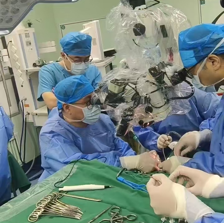 征得患者家属同意后,手术及时开展。术中,王庭忠主任、神经外科三病区主任医师杜晓光等手术团队成员密切协作,通力配合,借助高倍显微镜的放大视野,仅从颈部选取5厘米左右小切口,精准定位到隐匿于复杂组织结构中的目标淋巴和静脉,并进行淋巴-静脉吻合。