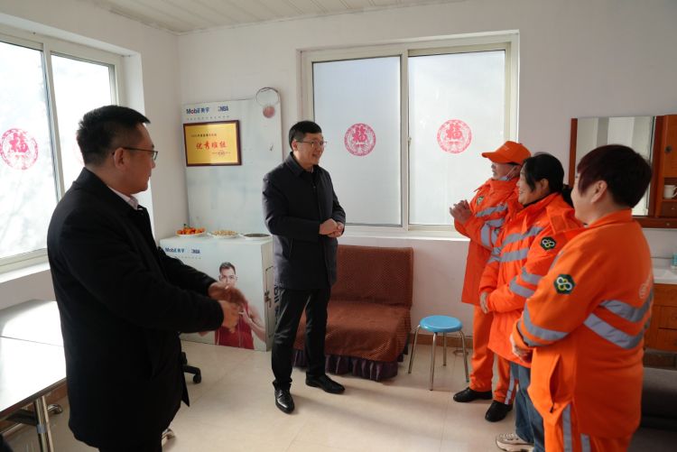 在淄博十一中门口环卫之家,王晓东和环卫工人亲切交谈,并送上慰问品和新春祝福。他指出,广大环卫工作者用劳动和汗水守护城市美丽,希望大家注意防寒和自身安全,继续发扬爱岗敬业、无私奉献的精神,努力为城市面貌改善、城市品质提升贡献更多力量。