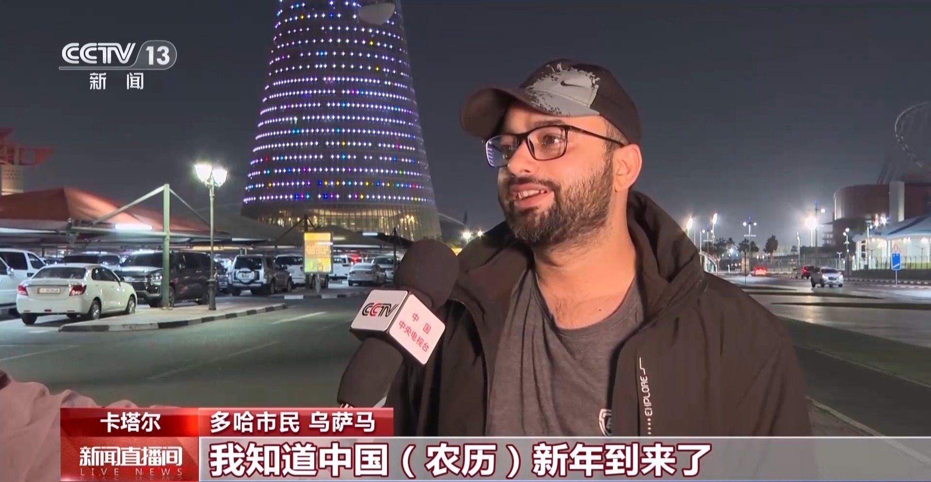 多哈市民 乌萨马:我知道中国(农历)新年到来了,龙年过去,新的一年是蛇年,祝中国和中国朋友新年快乐。我热爱中国人民,他们工作勤奋,中国发展也非常快。