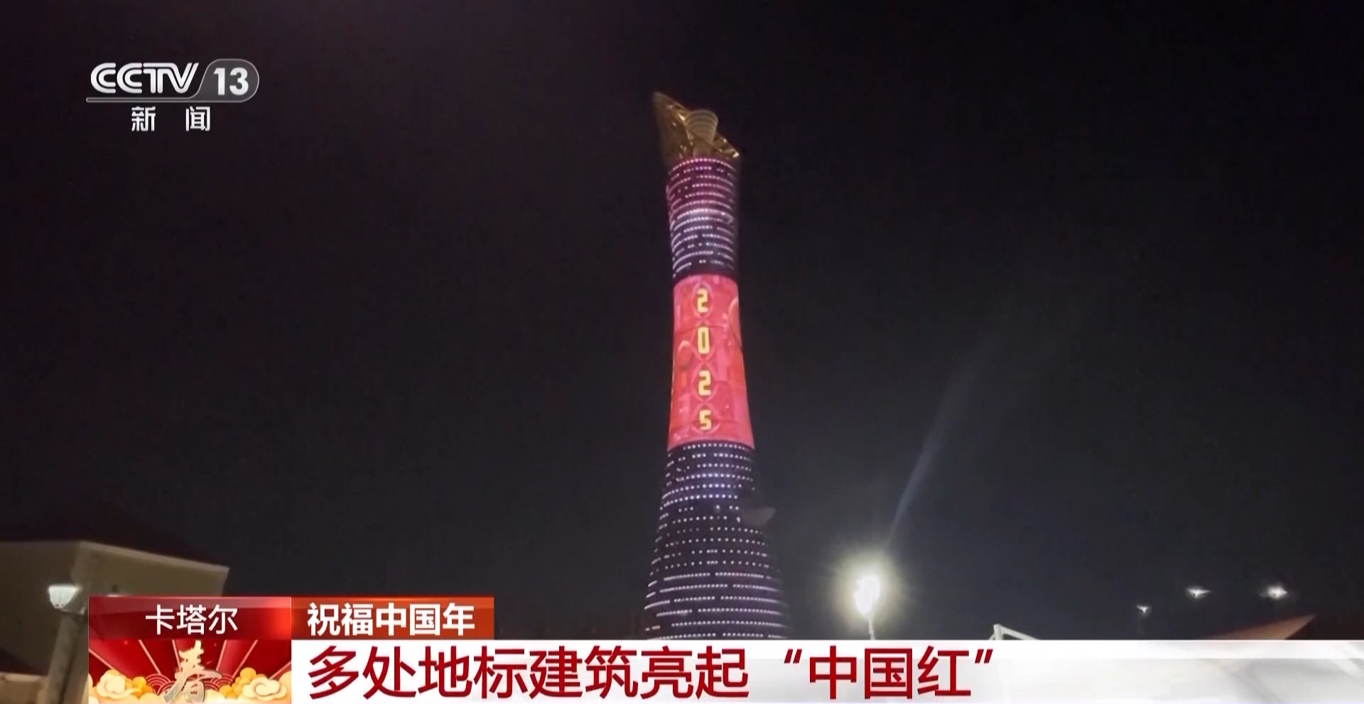 28日晚,卡塔尔首都多哈地标性建筑火炬塔、伊斯兰艺术博物馆、卡塔尔国家博物馆、瓦赫达拱门等多处建筑同时亮起“中国红”,喜迎新春佳节的到来。在红色灯光的映照下,“欢乐春节”等中文被投射到建筑上,增添了欢乐的节日氛围,也吸引不少当地民众驻足观看。