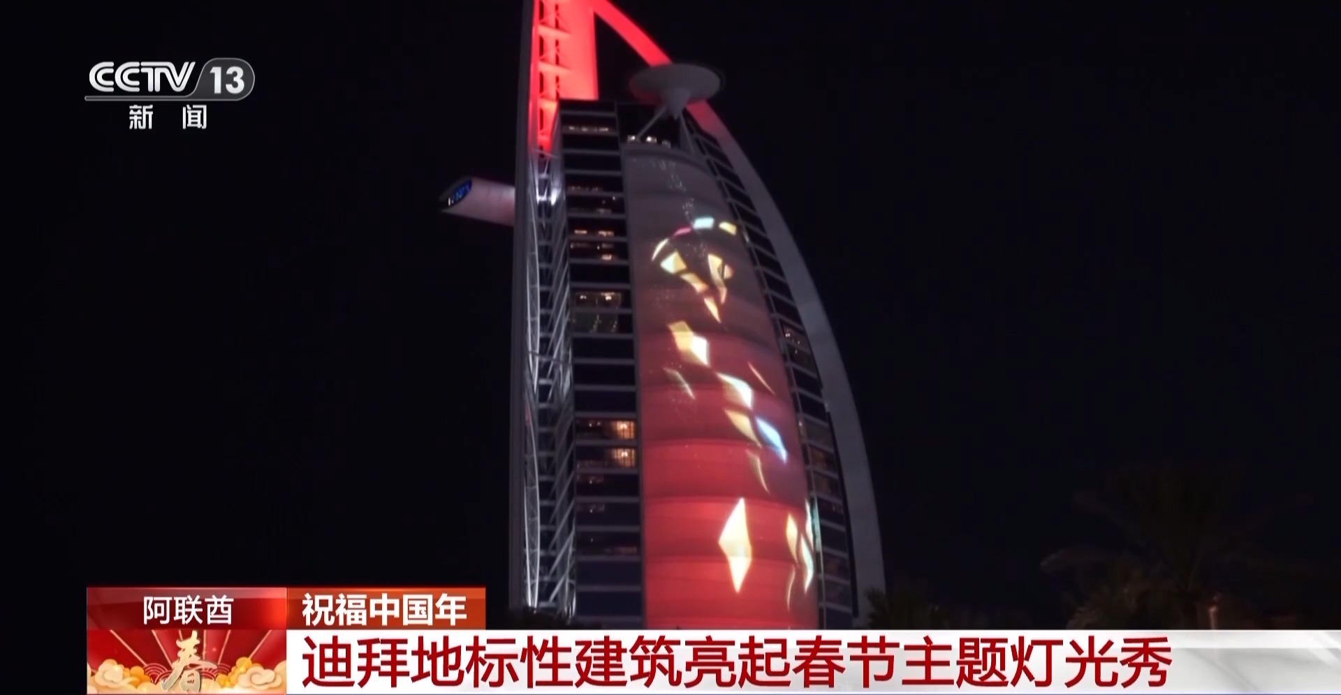 同一天,阿联酋迪拜地标性建筑——帆船酒店亮起春节主题灯光秀,以中国国家级非遗传承人作品为灵感的“金蛇献瑞”动画在酒店外墙上放映,为全球华人送上祝福。