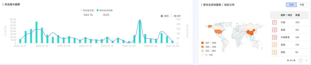 1月30日凌晨,即农历大年初二,奇安信XLab实验室监测发现,针对DeepSeek(深度求索)线上服务的攻击烈度突然升级,其攻击指令较1月28日暴增上百倍。XLab实验室观察到至少有2个僵尸网络参与攻击,共发起了两波次攻击。