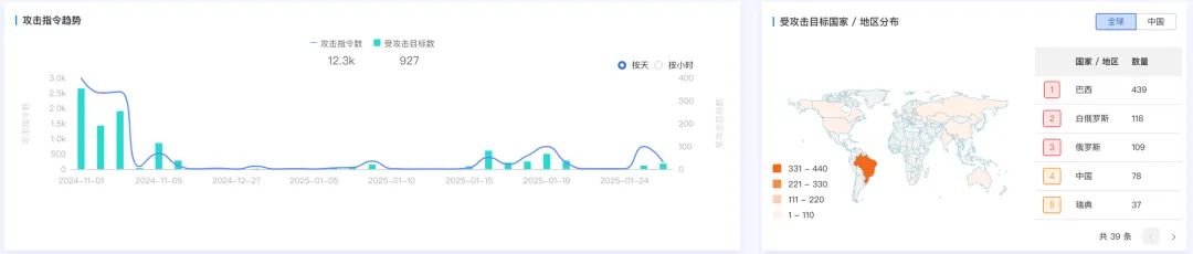 其中,RapperBot平均每天攻击上百个目标,高峰时期指令上千条,攻击目标分布在巴西、白俄罗斯、俄罗斯、中国、瑞典等地区。具体攻击指令趋势和攻击目标地区分布如下图: