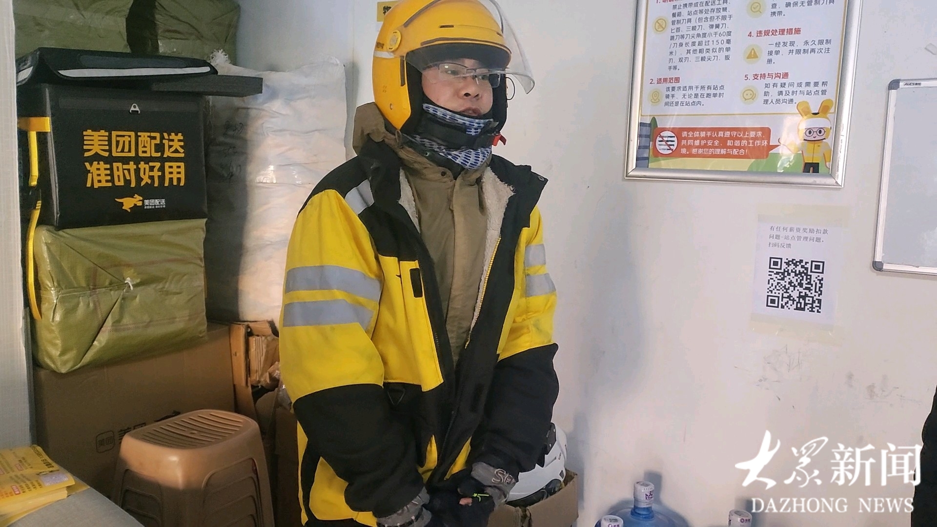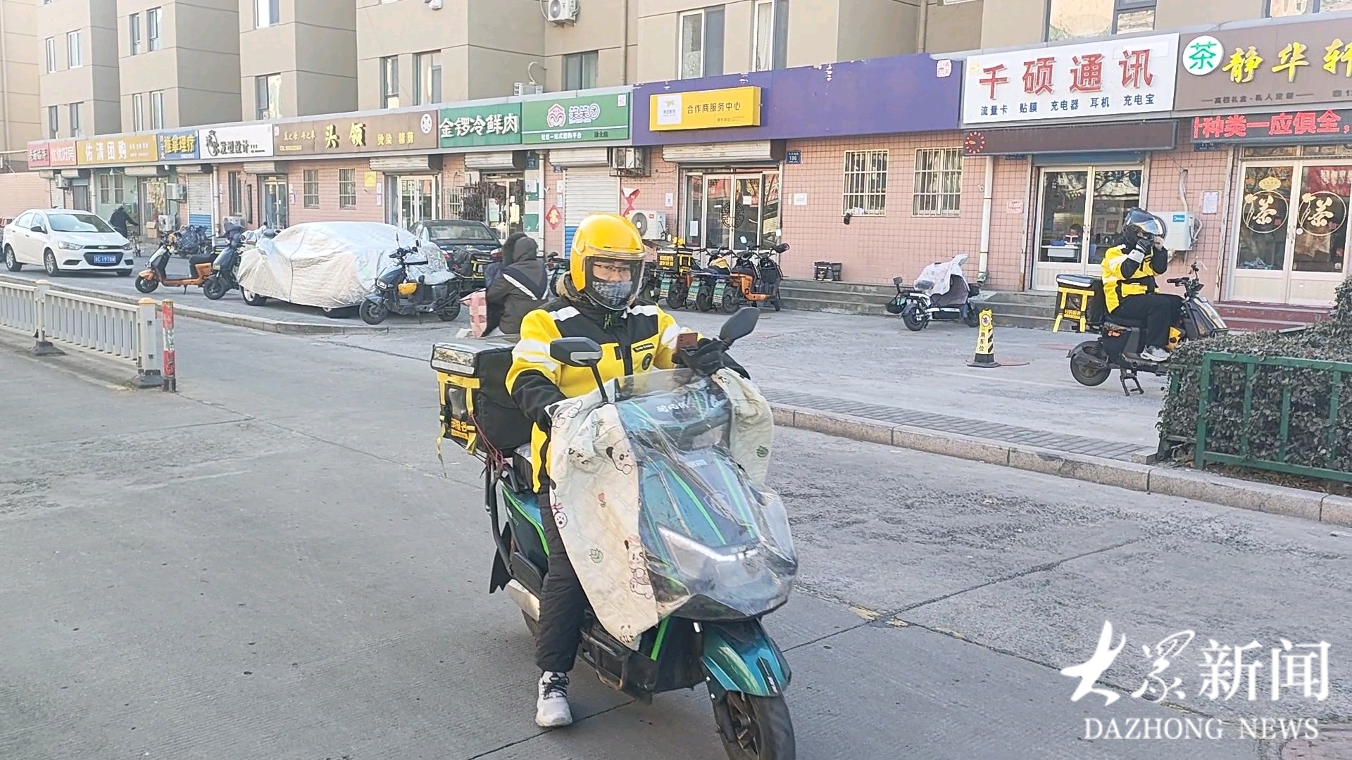 穿上工作服,戴上头盔、口罩、手套,在-11℃的寒冬,“全副武装”的海晏踏上电动车。