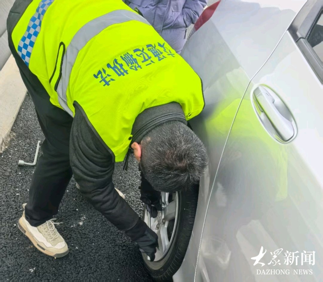 大年初三,9时10分许,高速路政三大队执法队员巡查至泰东高速9K+600M东平方向处时,发现一辆小轿车开着双闪停在应急车道内,驾驶员在车尾来回踱步焦急万分、不知所措,正值春节期间,路面车流量较大,过往车辆纷纷减速避让,情况十分危险。见此情况,执法队员立即拉响警报并做好安全防护,通过询问得知,原来此车行驶过程中右后车胎突然爆胎,不得已司机将车停在应急车道,但因自己从未换过轮胎,无从下手。