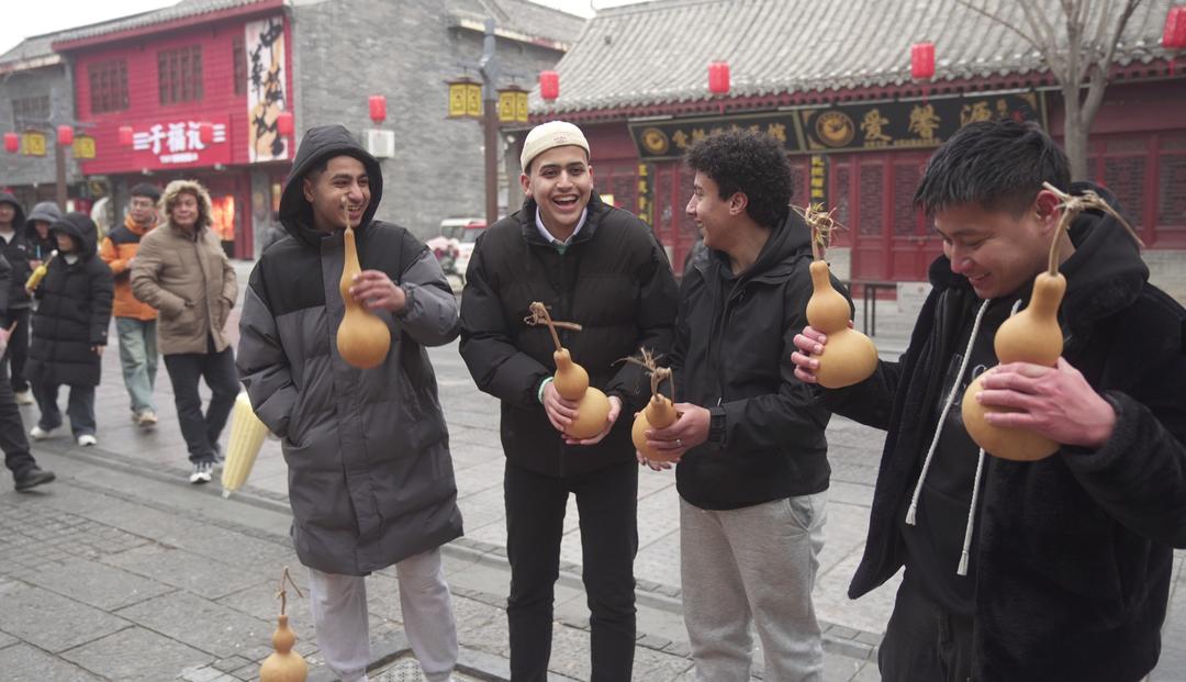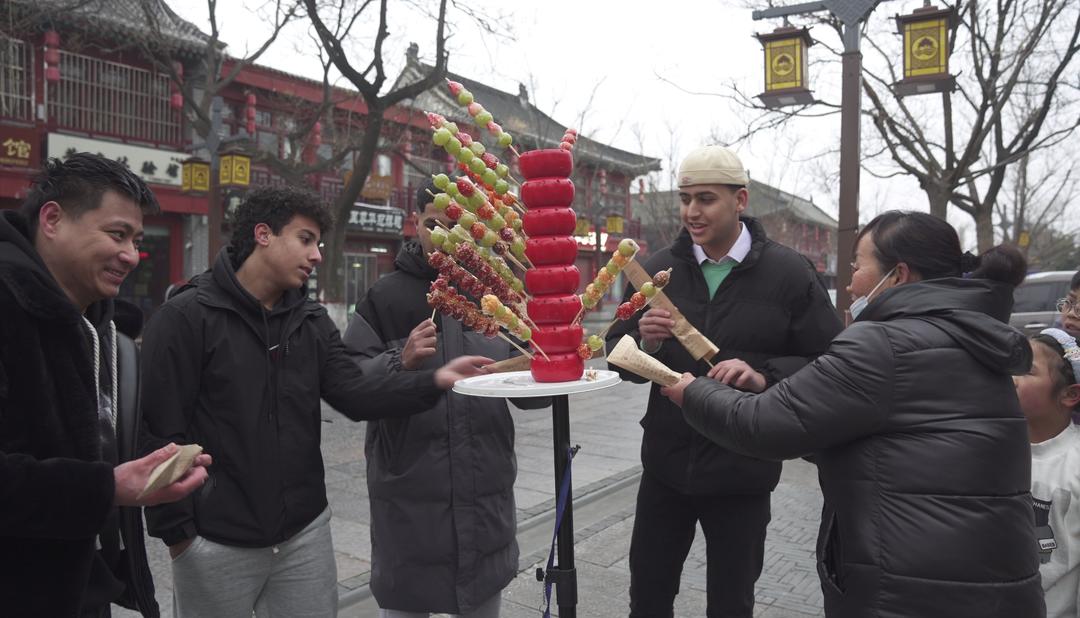 1月31日,大年初三,聊城水上古城游人如织。四张“洋面孔”随着人流这边瞅瞅、那边看看,一会儿每人买上一串糖葫芦,一会儿又跑到非遗展位前驻足观赏。