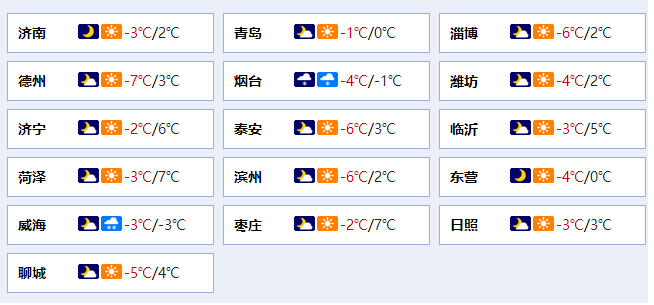 最低气温:鲁西北、鲁中山区和半岛内陆地区-5℃左右,其他地区-3℃左右。