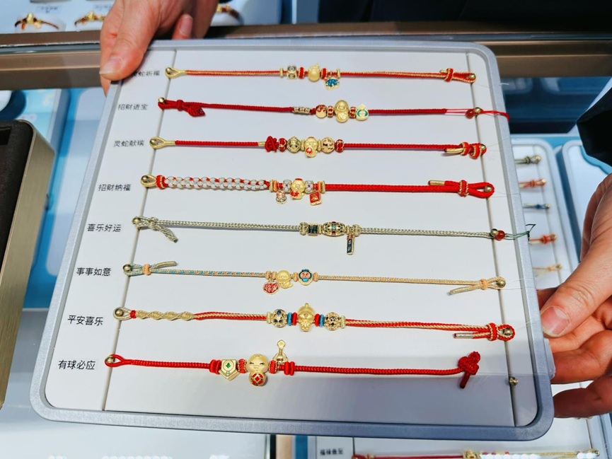 珠宝首饰柜台也被“蛇元素”占领。“卷卷蛇”“小灵蛇”等Q版小蛇转运珠、项链、手链、耳饰等受到年轻人的青睐。周大福、六福、谢瑞麟等各大首饰品牌推出造型各异的金饰,中银珠宝永旺东部购物中心店副经理郝文彬表示,尽管年底金价上涨,但生肖黄金饰品销量一直走高,生肖转运珠尤其受欢迎。