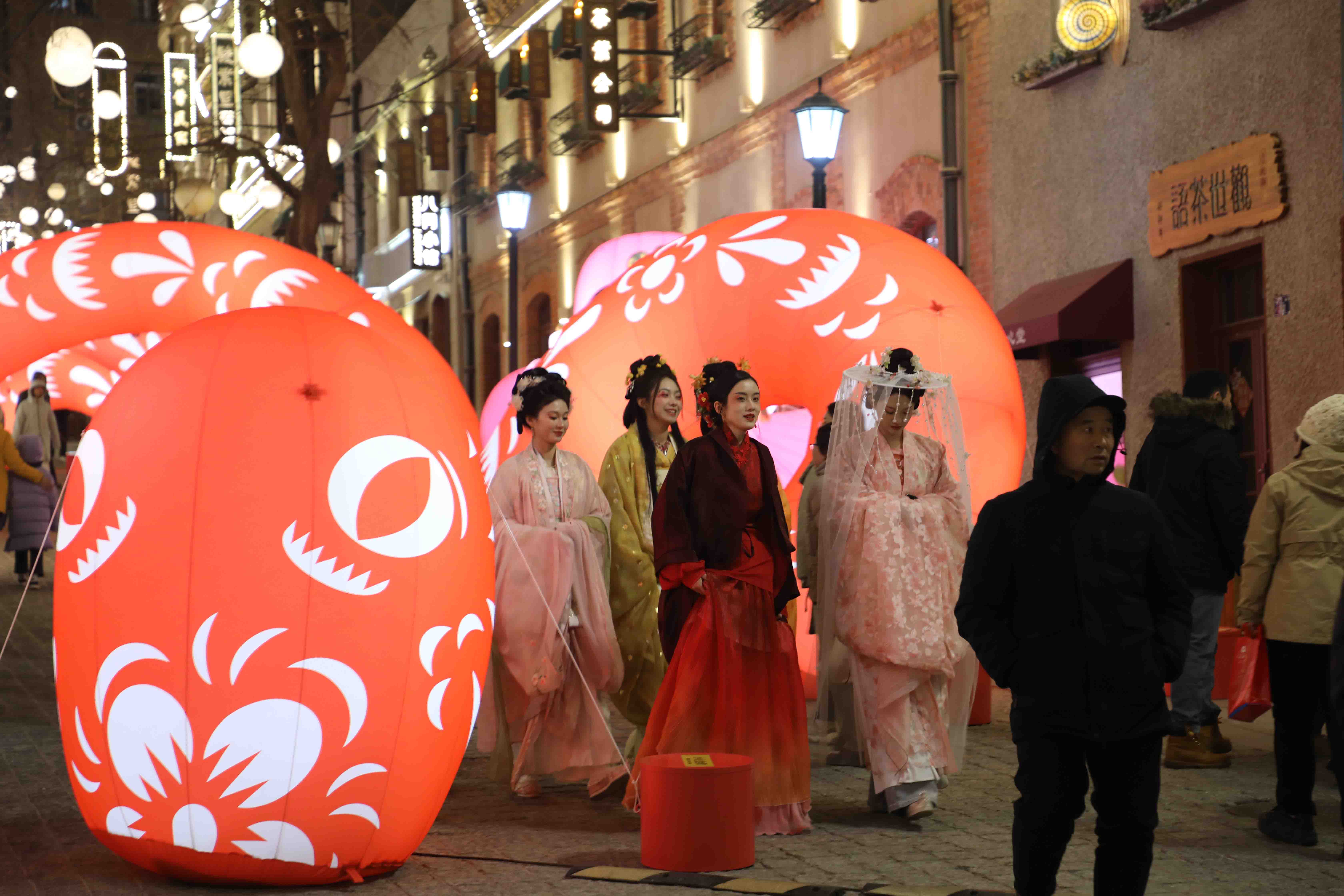中山路及周边老城区同样游人如织,喜庆的文艺演出、红彤彤的蛇年装饰物吸引大量市民游客互动、拍照。海誓山盟广场、肥城支路等地,通过市集与主题IP互动的方式,打造出冬日逛吃、娱乐结合的多元打卡地,让市民游客流连忘返。值得一提的是,中山路上的“时光电车”在除夕正式开放,春节假期期间,市民游客可乘坐电车,领略黄河奔腾、海浪涌动的壮丽景象,感受百年前青岛街头的流金岁月。
