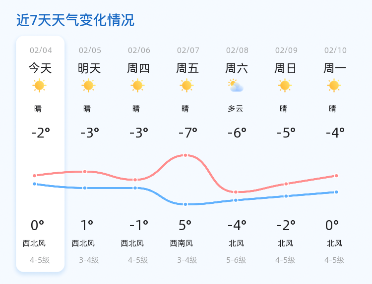 2025年2月4日,正月初七,青岛今日天气晴朗,气温在-2℃至0℃之间徘徊,西风3级轻拂,空气湿度为51%,空气质量良好,PM2.5指数为33。市区及各区均以晴朗天气为主,适宜户外活动和走亲访友,但早晚温差较大,市民需适时增减衣物,以防感冒。