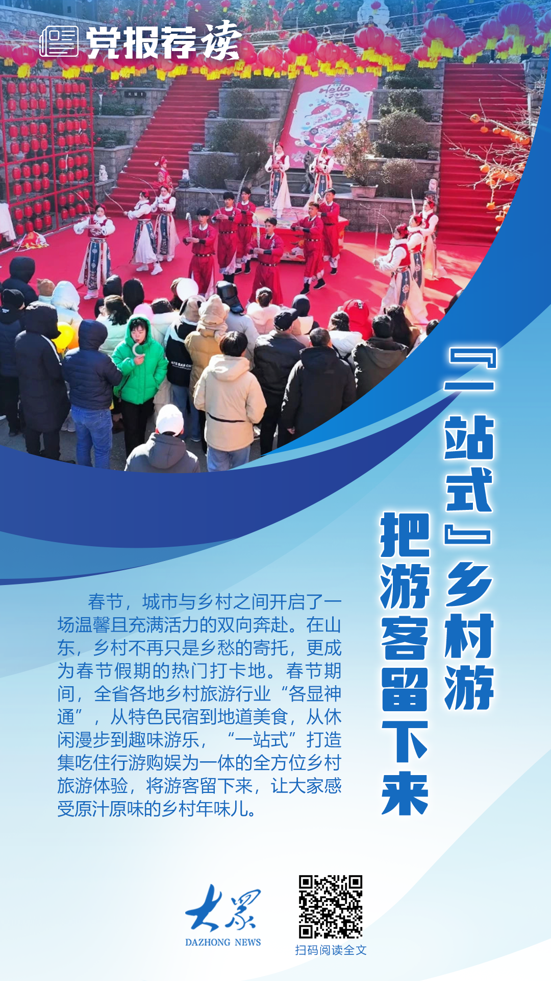 这个春节,从单一观光游到“吃住行游购娱”全链条一站式深度体验,齐鲁乡村游的变化令人刮目相看。便捷的交通网络,让游客可抵达乡村的各个角落;多样的住宿设施,满足不同游客的需求;丰富的美食,将地道的乡村风味送上餐桌;各类游玩项目,涵盖民俗体验、田园采摘、户外运动等多个领域……这一切,让游客沉浸在乡村的自然风光与民俗文化之中,也让乡村旅游焕发出新生机。