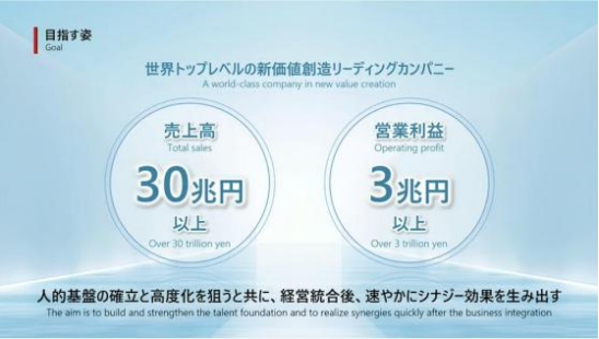 据新闻发布会内容,合并后,新集团目标整体年销售额超30万亿日元(约合人民币1.4万亿元),营业利润超3万亿日元(约合人民币1399亿元)。