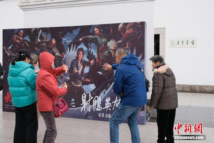 2月1日,游客在金庸故居前比划武侠招式。中新社记者 曹丹 摄