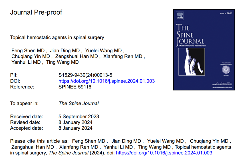 脊柱外科手术过程中止血问题一直是脊柱外科医生面临的难题和关键问题。青大附院脊柱外科平度病区副主任沈峰博士,全面回顾目前可用的局部止血剂,并总结其机制和应用,完整的阐述了不同的止血材料在脊柱手术中的作用。该文章于今年8月份发表在脊柱外科临床专业顶刊杂志《The Spine Journal》(中科院一区,IF=4.9)。沈峰副主任医师为第一作者,王亭教授为通讯作者。