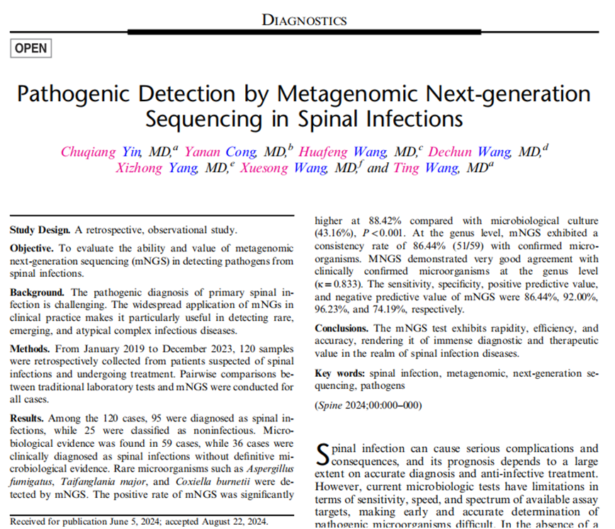 临床中原发性脊柱感染的病原诊断具有挑战性。脊柱外科平度病区殷楚强医生通过回顾性分析近年来120个疑似脊柱感染病例,进行了传统的实验室测试和宏基因组测序(mNGS)分析,证实了mNGS 在脊柱感染疾病领域的价值。该文章于8月发表于脊柱外科临床专业顶刊杂志《Spine》(中科院二区,IF=3.2)。殷楚强医生为第一作者,王亭教授为通讯作者。