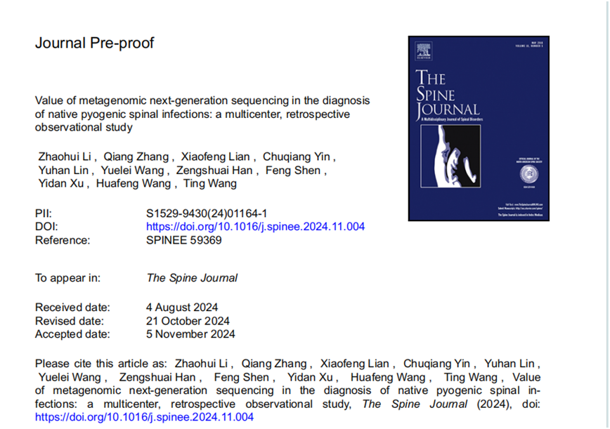 化脓性脊柱感染的致病菌诊断在临床治疗中至关重要。青大附院脊柱外科平病区主任王亭教授2024级硕士研究生李昭辉通过回顾性4家医院多中心研究,证实了二代宏基因组测序在鉴定原发化脓性脊柱感染病原菌方面的价值。该文章于11月发表在脊柱专业临床顶刊杂志《The Spine Journal》(中科院一区,IF=4.9)。青大附院脊柱外科平度病区2024级研究生李昭辉为第一作者,王亭教授为通讯作者。