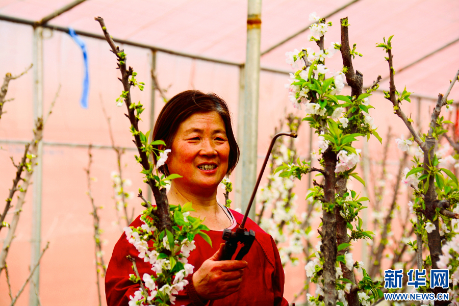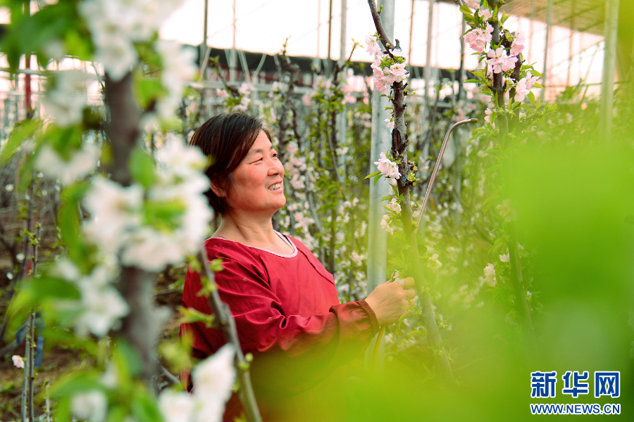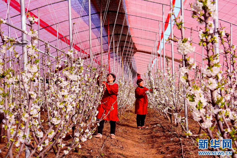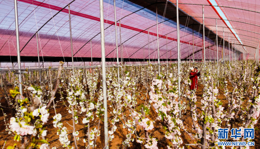 大棚中的樱桃花竞相绽放。新华网发(李学飞 摄)