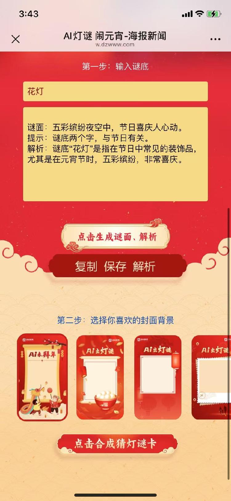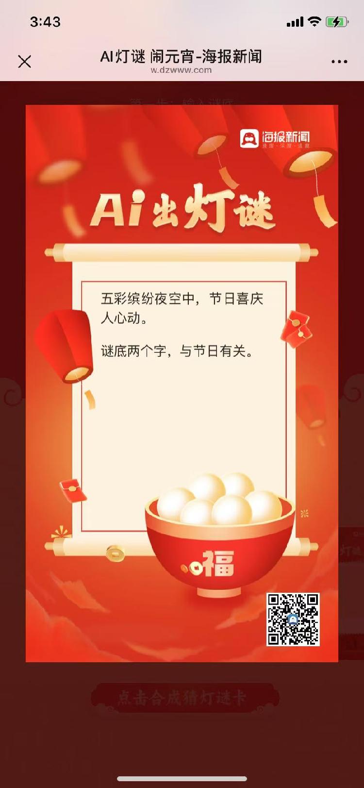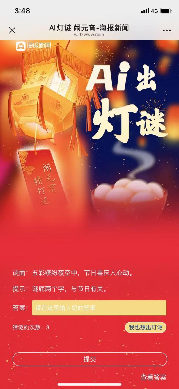元宵节,海报新闻客户端推出——“AI元宵猜灯谜”,为用户提供一个既有趣又富有挑战性的猜灯谜体验。