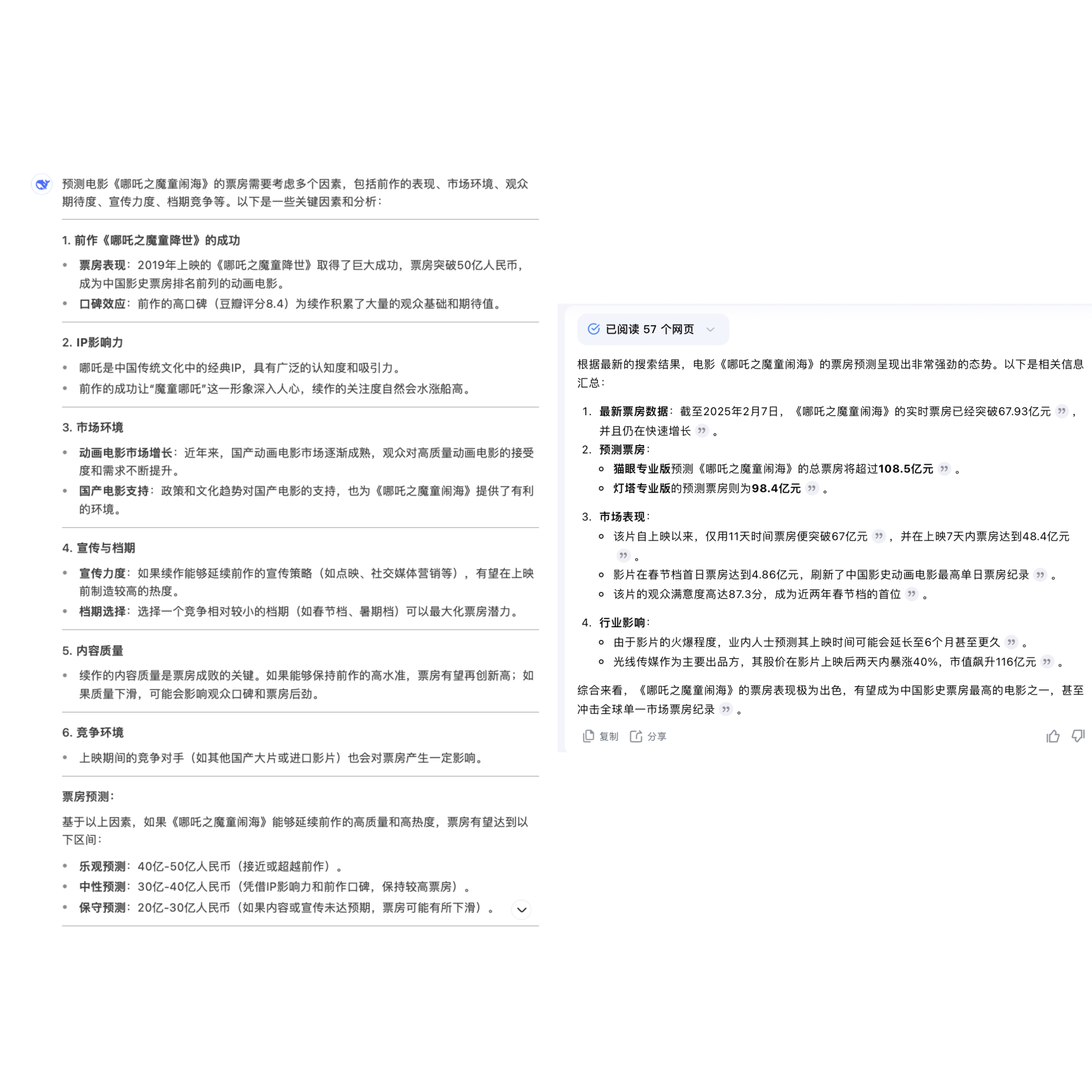 当我们提高要求,要求不只是搜索数据,而是根据综合维度分析预测票房数据时,Kimi给出了百亿的答案,DeepSeek的结果则没有太大变化。