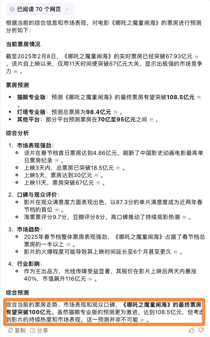 比如在预测电影《哪吒之魔童闹海》票房时,Kimi给出的答案更加完整,而且有理有据更贴近实际,DeepSeek则过于生搬硬套程式化,明显缺乏训练和分析能力,且答案竟然没有实时更新,给出了乐观预测40-50亿的答案。
