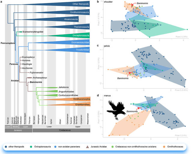 中生代兽脚类恐龙(包括鸟类)演化树,以及前肢、肩带和后肢的形态空间 王敏 供图