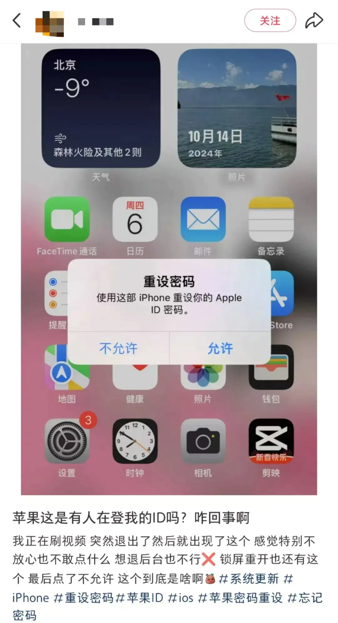 上游新闻记者在社交媒体上发现,最近有不少苹果用户都在发帖称,收到了类似的要求重设密码的弹窗提醒。河南洛阳一位网友称,自己点了“不允许”,但随后系统仍多次提醒,自己不得不多次重复锁屏解锁,但系统依然多次弹窗,“因为怀疑是诈骗,在网上查了之后,我去设置里自行更改,然后把苹果账户的支付全部删除了,在设置里更改了解锁密码,终于不再弹窗了。”
