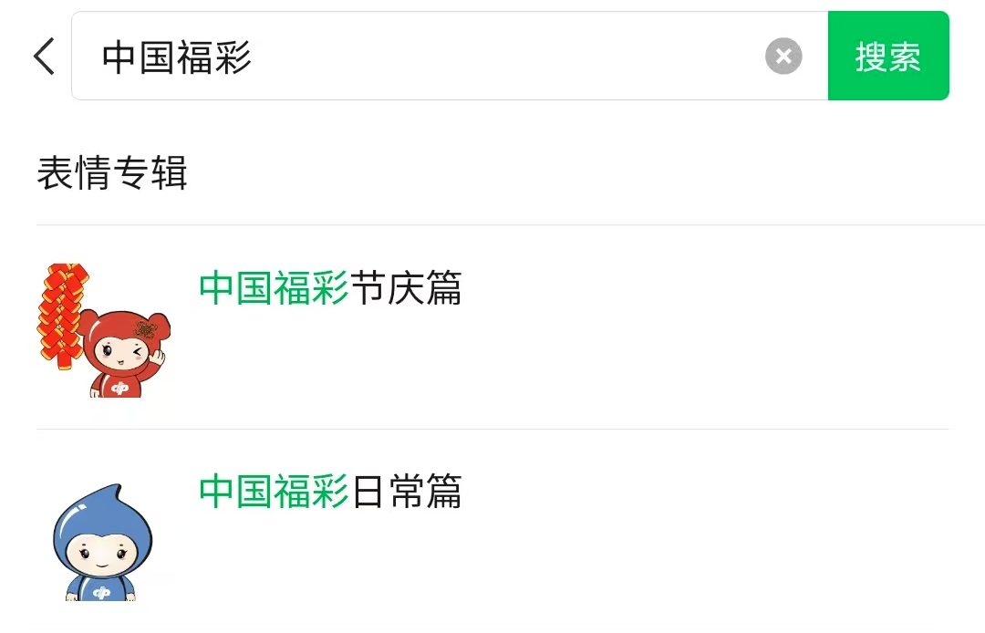 步骤3:在搜索框中输入“中国福彩”(中国福彩日常篇、中国福彩节庆篇)进行搜索,点击表情专辑进入下载页面;