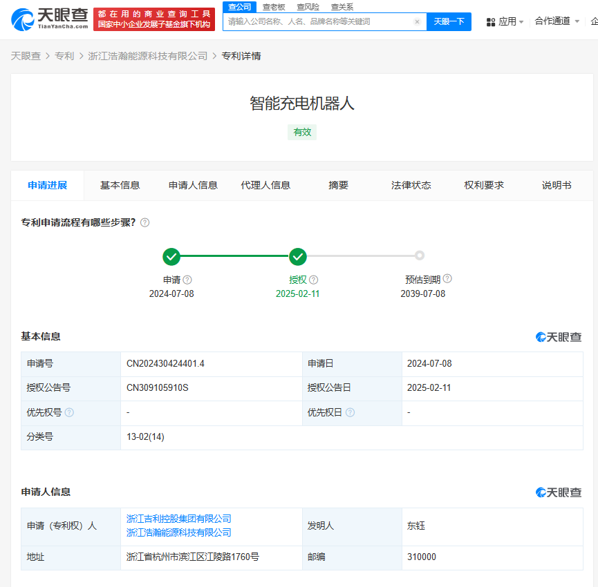 天眼查知识产权信息显示,近日,浙江吉利控股集团有限公司、浙江浩瀚能源科技有限公司申请的“智能充电机器人”外观专利获授权。