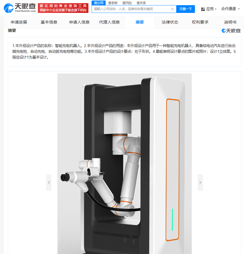 摘要显示,本外观设计产品用于一种智能充电机器人,具备给电动汽车进行自动插充电枪、自动充电、自动拔充电枪等功能,本外观设计产品的设计要点在于形状。