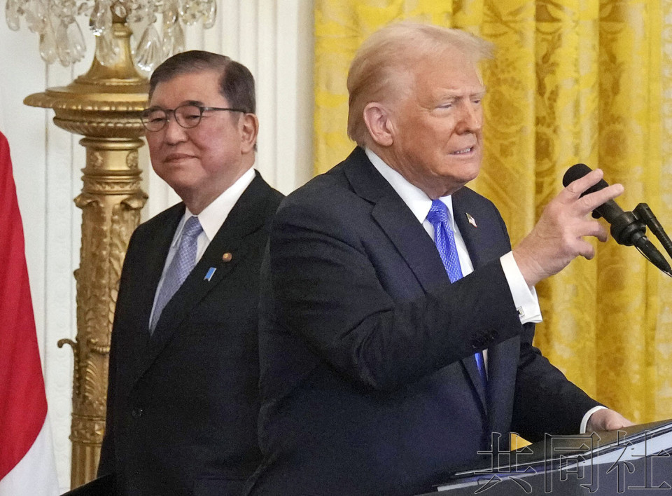 7日,美国总统特朗普(右)和日本首相石破茂在首脑会谈后出席联合记者会。