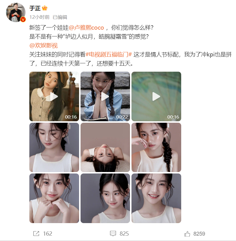 2月14日,于正发文:新签了一个娃娃@卢雅熙coco ,你们觉得怎么样?是不是有一种“垆边人似月,皓腕凝霜雪”的感觉?
