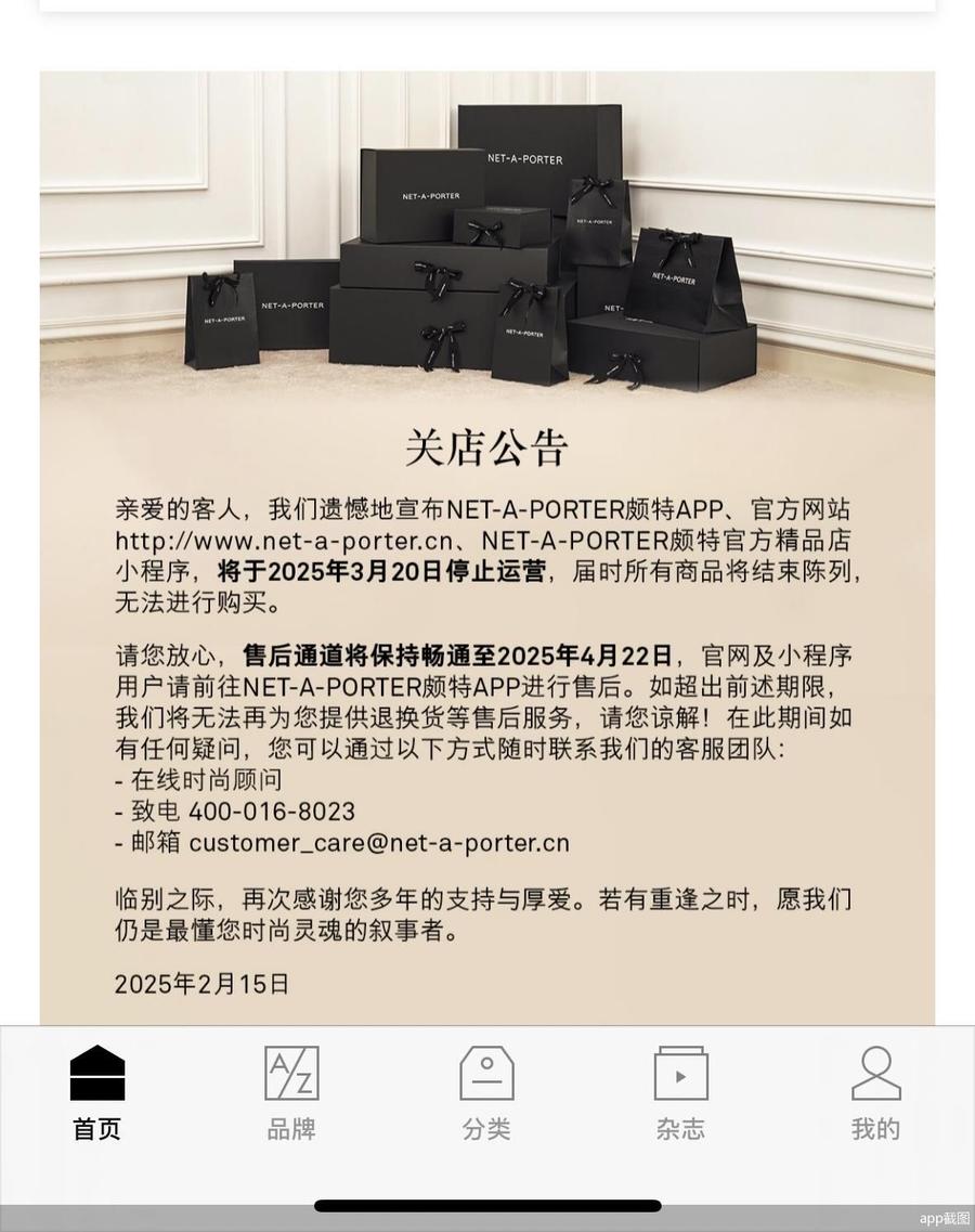 奢侈品电商的日子举步维艰。Net-a-Porter App公告显示,该公司将于3月20日关闭天猫、微信小程序、小红书和抖音旗舰店,以及公司网站和App,并于4月22日终止售后服务。