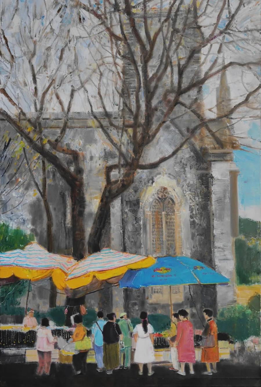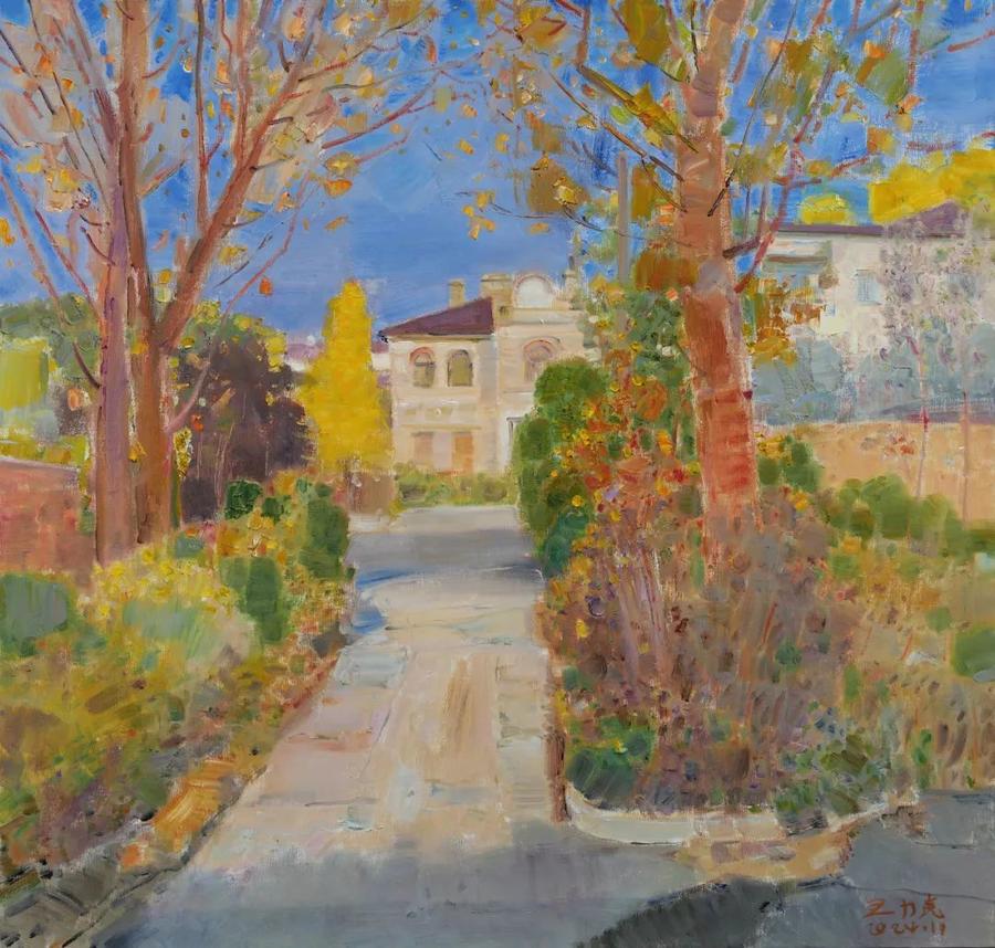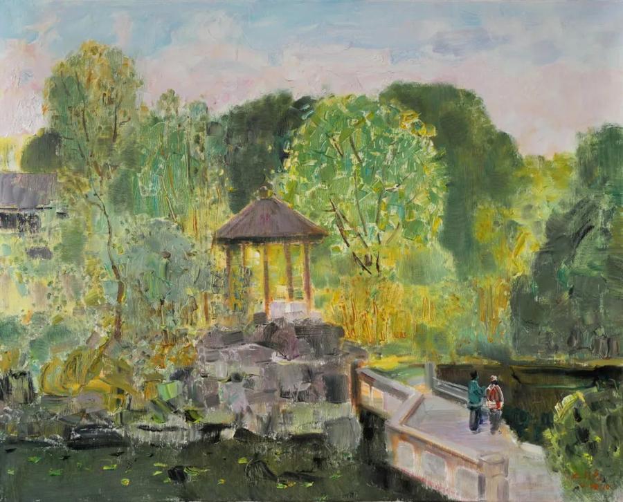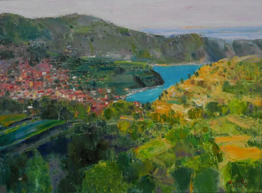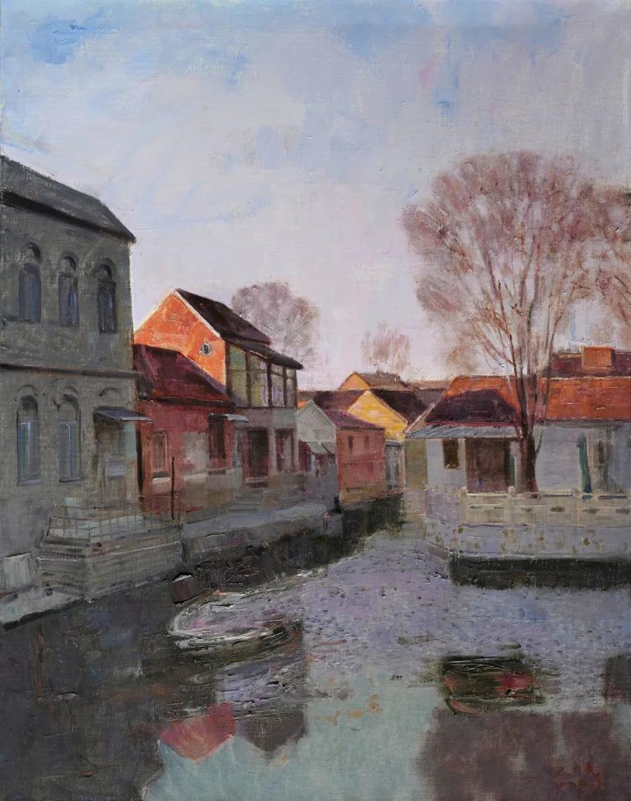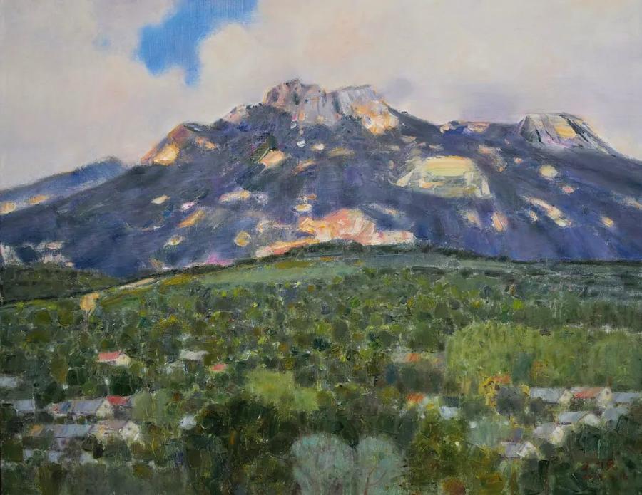 传统与现代的交融,东方诗意的视觉转译。王力克的风景画以“诗意景观”为核心叙事方式,其创作根植于中国传统文化中的“图真”理念。这种对东方美学的坚守,使他的风景画在写实框架下透露出文人画的超逸气质。在技法层面,注重“形色语言的动态和谐”,常以几何化的色块分割画面,这种“形色统一”的追求,既源于对荆浩“图真”理论的现代诠释,也体现了学院派画家对油画本体语言的深刻理解。