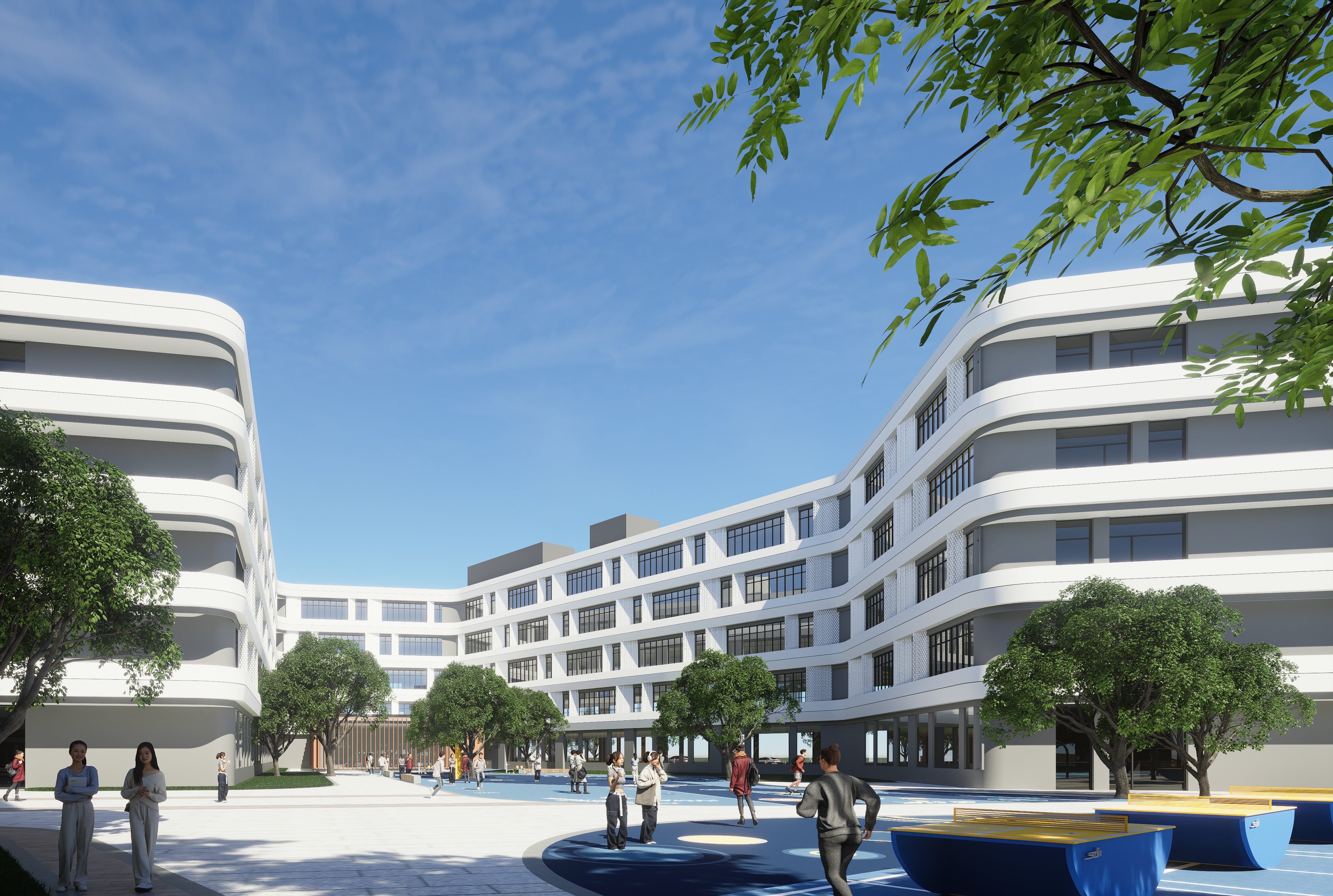 项目打造透明边界,校园与城市间视线渗透。这种设计理念促进了校园与城市的互动,打破了传统封闭校园的局限,让学生和社区更加融为一体。场地北侧结合景观设计裙楼,成为建筑和城市柔软的边界。通过边界模糊、内容丰富的流动空间,鼓励孩子们运用想象力开展各种活动和交流,营造多样的非正式学习空间。