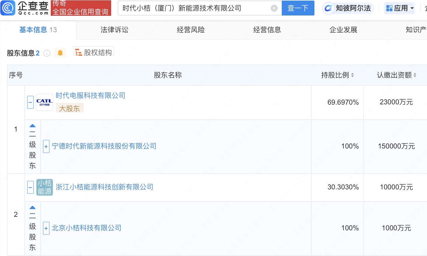 企查查APP显示,近日,时代小桔(厦门)新能源技术有限公司成立,法定代表人为杨峻,注册资本3.3亿元,经营范围包含:新能源汽车换电设施销售;电动汽车充电基础设施运营;蓄电池租赁;电池销售等。企查查股权穿透显示,该公司由宁德时代、滴滴出行关联公司北京小桔科技有限公司间接共同持股。