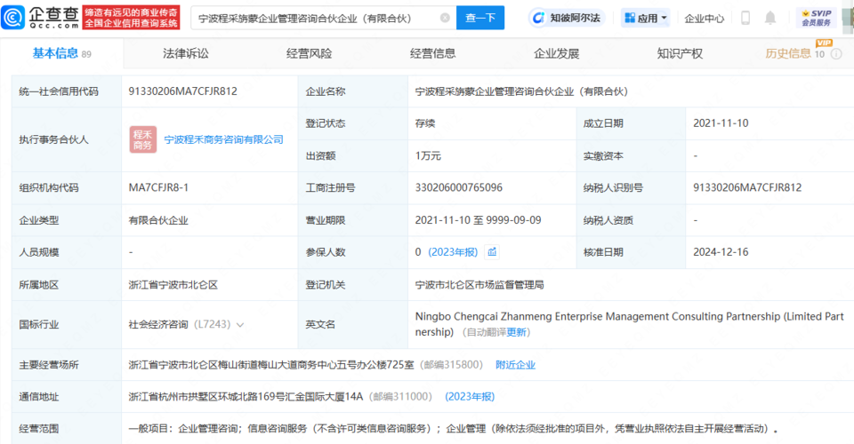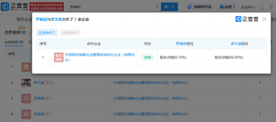 企查查APP线索,罗福莉与DeepSeek创始人梁文锋同为宁波程采旃蒙企业管理咨询合伙企业(有限合伙)合伙人。该合伙企业成立于2021年11月,执行事务合伙人为宁波程禾商务咨询有限公司,出资额1万人民币,经营范围包括企业管理咨询、信息咨询服务,由梁文锋、裴湉、罗福莉等共同出资,其中梁文锋持股比例为96%,罗福莉持股比例为0.1%。