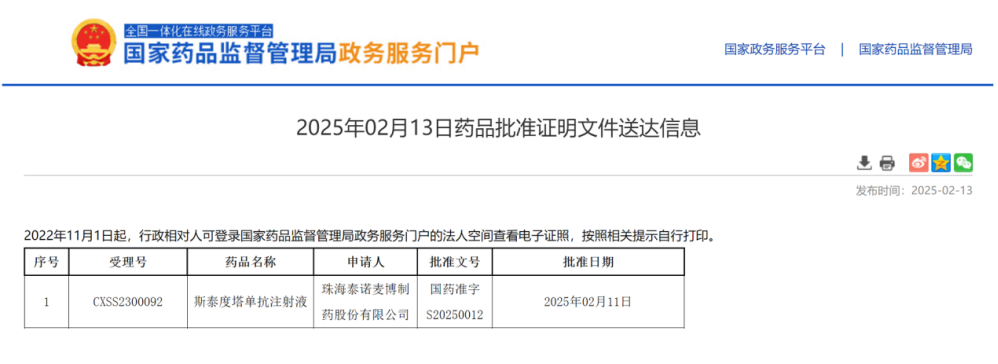 2025年2月11日,重组抗破伤风毒素单克隆抗体新药——新替妥®(中文通用名为“斯泰度塔单抗注射液”)的新药上市申请(NDA)正式获得中国国家药品监督管理局(NMPA)批准。