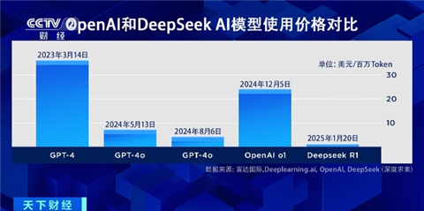 这张图由投资机构富达国际统计,展示了OpenAI和DeepSeek在每百万Token定价上的差异。可以看到,与OpenAI推出的几代模型相比,DeepSeek R1模型的价格很有竞争力。