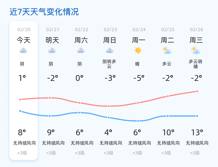相较于今日,聊城明天的天气状况变化不大,仍然维持阴天,不过气温将略有回升,最高气温可达9℃,而最低气温将下滑至-2℃。风力条件与今天相似,依旧是无持续风向且小于3级。市民朋友们在早晚出行时需注意适当增减衣物,以防感冒。