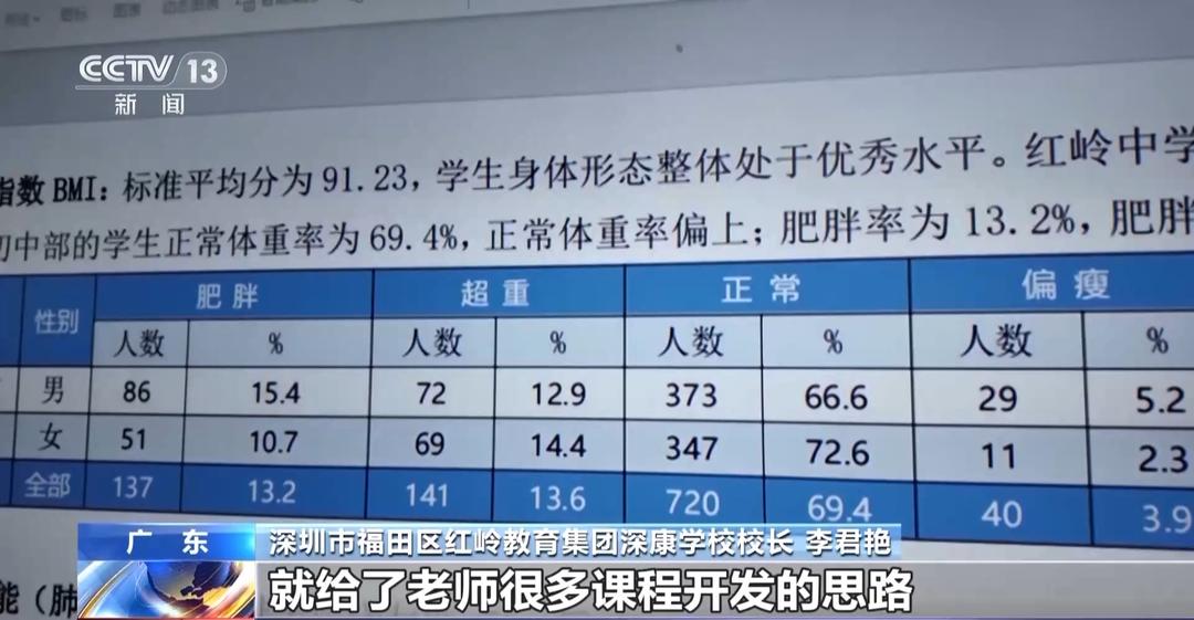 深圳市福田区红岭教育集团深康学校校长 李君艳:这是我们去年孩子的体质健康监测数据,肥胖率偏高。通过这些数据的分析和建议,给了老师很多课程开发的思路。我们这学期将在孩子的体能和耐力方面多开发一些课程,让孩子把肥胖率指标降下来。