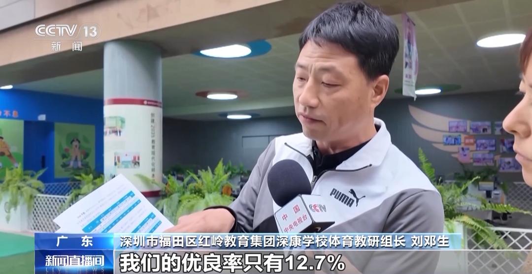 深圳市福田区红岭教育集团深康学校体育教研组长 刘邓生:来看一下我们引体向上的数据,我们的优良率只有12.7%,说明学生非常缺乏上肢力量。