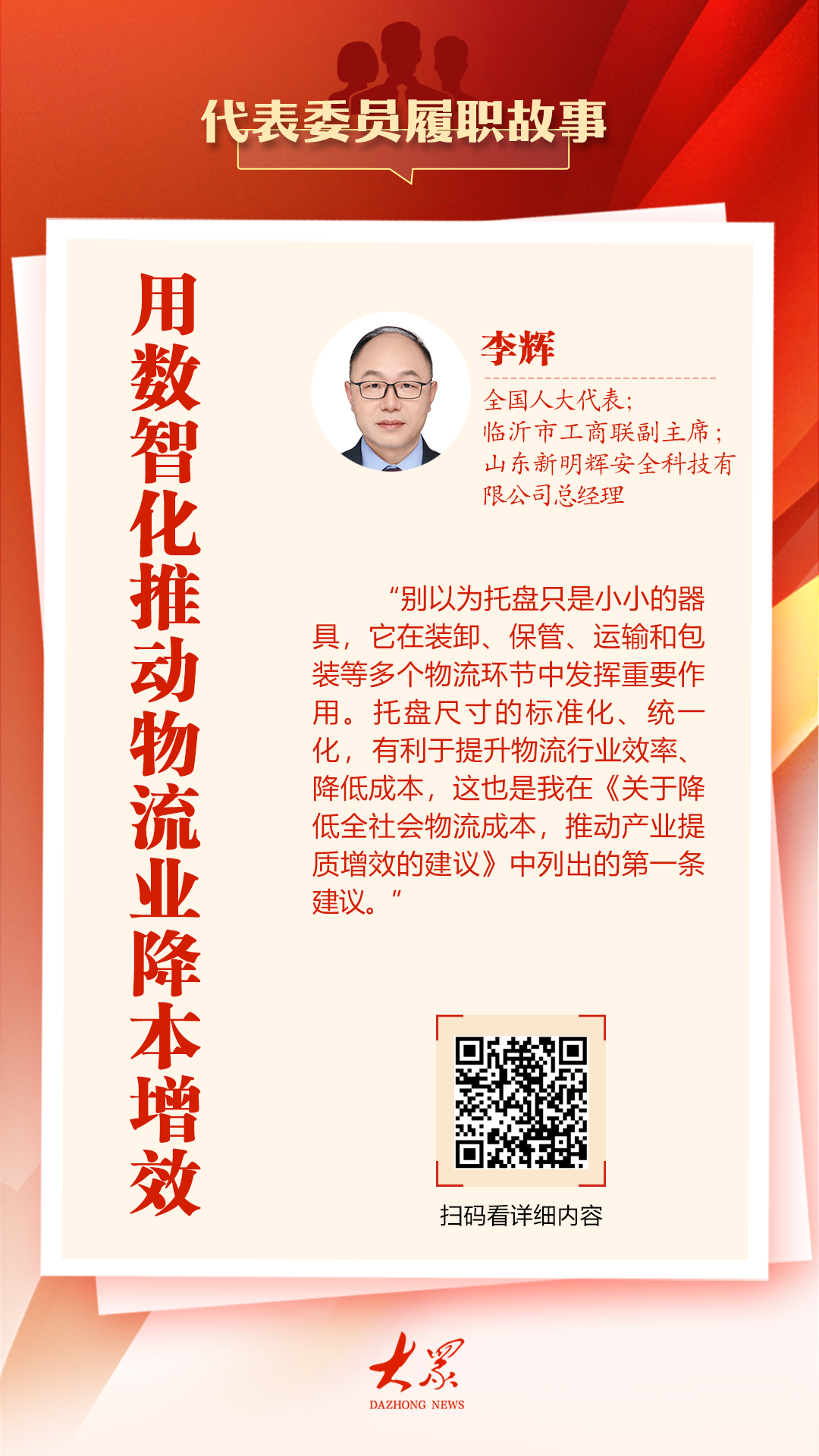 “别以为托盘只是小小的器具,它在装卸、保管、运输和包装等多个物流环节中发挥重要作用。托盘尺寸的标准化、统一化,有利于提升物流行业效率、降低成本,这也是我在《关于降低全社会物流成本,推动产业提质增效的建议》中列出的第一条建议。”