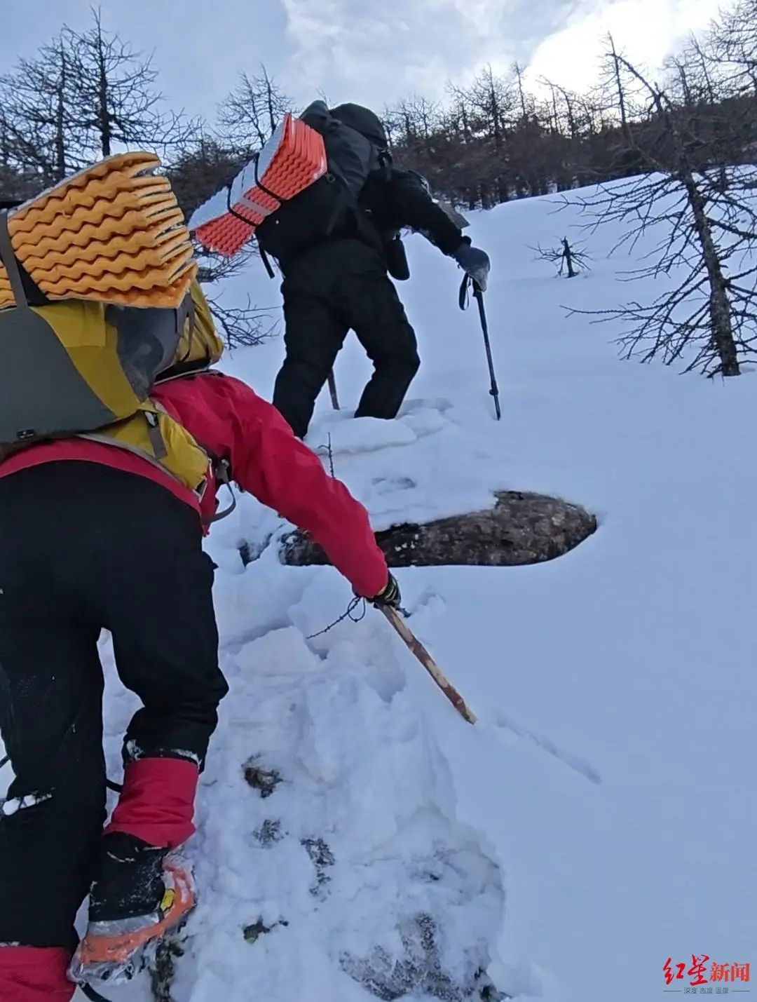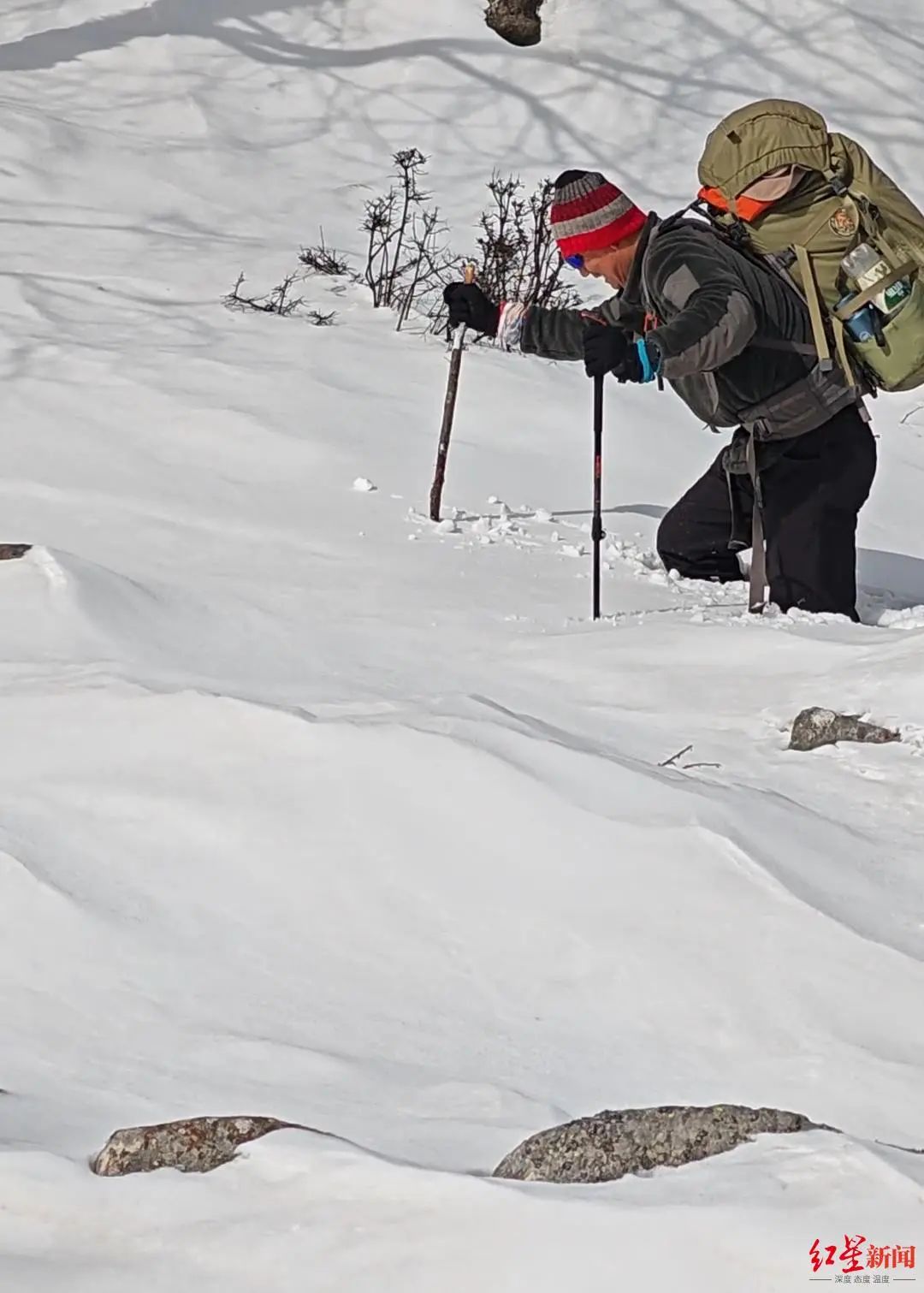 因为沙沟峡附近雪厚,石海路比较多,一路上有很多乱石堆,有时候两个小时才能走完一公里路程。“我们的队员有摔伤的、冻伤的、滑坠受伤的。经过沙沟峡冰面时,被深潭拦住去路,最后队员是攀爬右侧岩壁通过,风险性极高。”