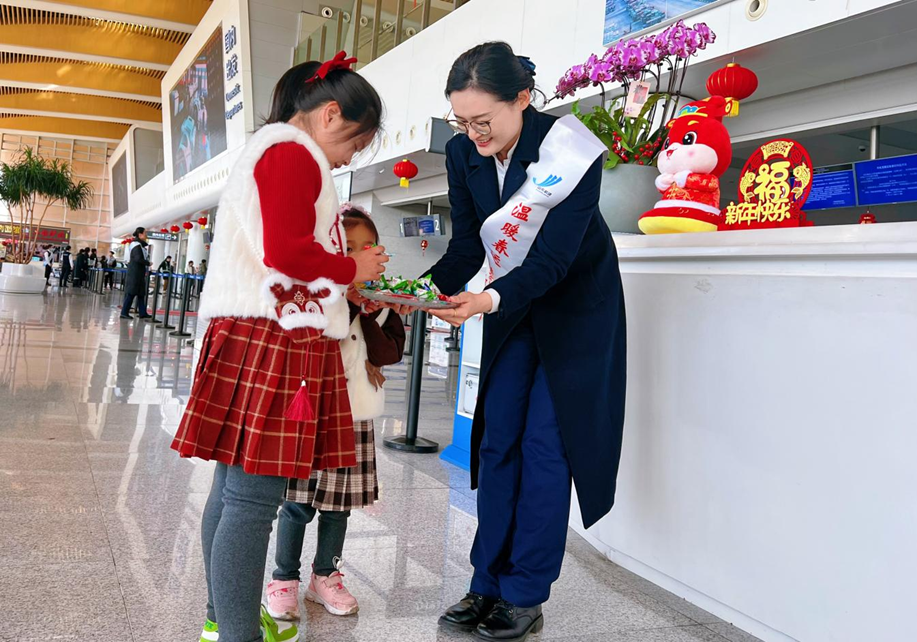 春运期间,日照机场通过开展开展除夕、元宵节等特色节庆日活动,为过往旅客在忙碌的旅途中送上浓浓的节日祝福,让旅客在美好航空出行中体验到幸福感和获得感。